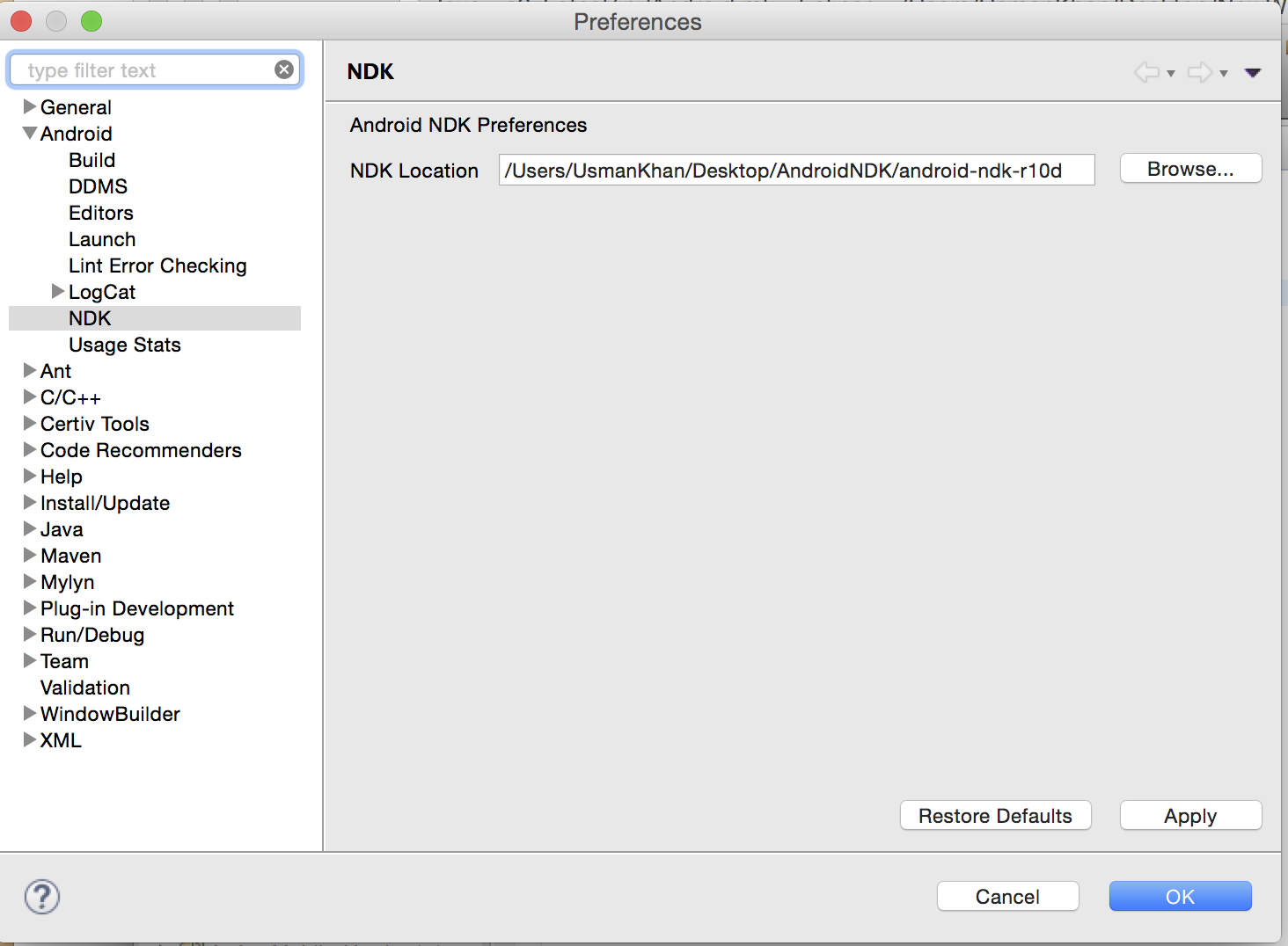 我正在使用在mac中开发android应用程序。我已经在Eclipse中给出了NDK路径。最后,当我命令使用android构建我的应用程序时,得到以下错误: