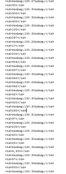 然后,上面的代码将删除每个<td>number</td>标记,同时保留每个<td>$ number </td>。