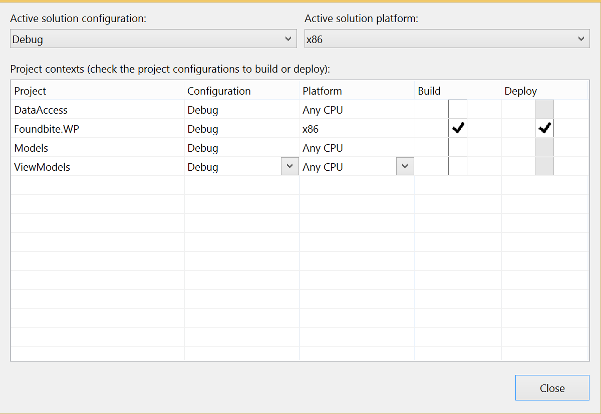 接下来,将平台看作是允许使用一个目标体系结构构建解决方案中的所有项目的配置选项,或者根据要部署/运行它们的位置来构建其他项目:当您有不支持AnyCPU的本机代码项目,并且希望在模拟器(x86)或实际设备(ARM)中测试它们时,这一点尤其有用。此外,不要将平台名称与构建项目的实际体系结构相混淆;默认情况下,它是该体系结构的名称,但您可以将其更改为任何类似的名称(例如,Xamarin iOS将iPhone用于物理设备的ARM构建,iPhoneSimulator用于x86模拟器。