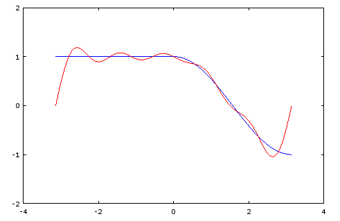 end它应该给出如下的图(蓝线是原始函数,红线是Fourier级数展开):