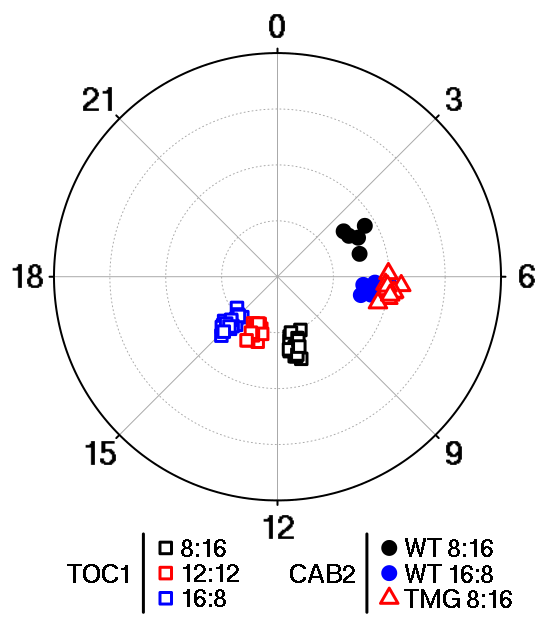 (C)在指示光周期下,TOC1 1:LUC和CAB2 2:LUC在野生型和TMG植物中的表达相图。相(相/周期×24 h)用相对振幅误差表示的节律强度作图。节奏强度从0(地形图的中心)到0.8 (圆周),这分别表示出强烈的节奏和非常微弱的节奏。