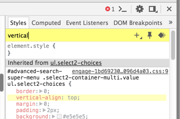 随着Chrome最近的一些更新,搜索字段已经移动。现在它出现在CSS列的顶部,与“新样式规则”(加号)、"Toggle Element State“(图钉)和”动画控件“(堆叠菱形)按钮相同: