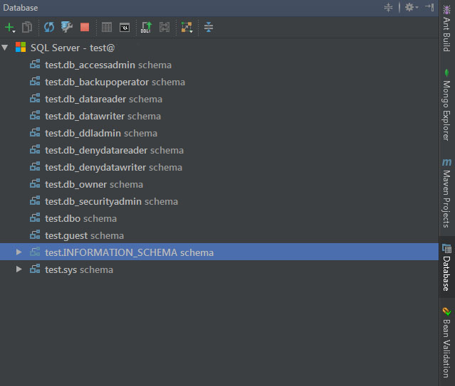 当我在IntelliJ中单击“”时,它为测试和另一个数据库正确地连接,但是其中一个并没有真正显示表。