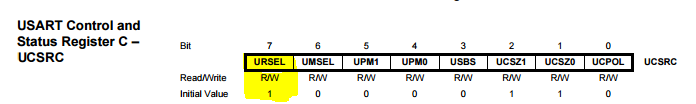 FOSC/16/BAUD-1RXEN和TXEN中启用UCSRBUCSRC和parity bit的要求,在stop bit中设置合适的位请参阅下列图片: