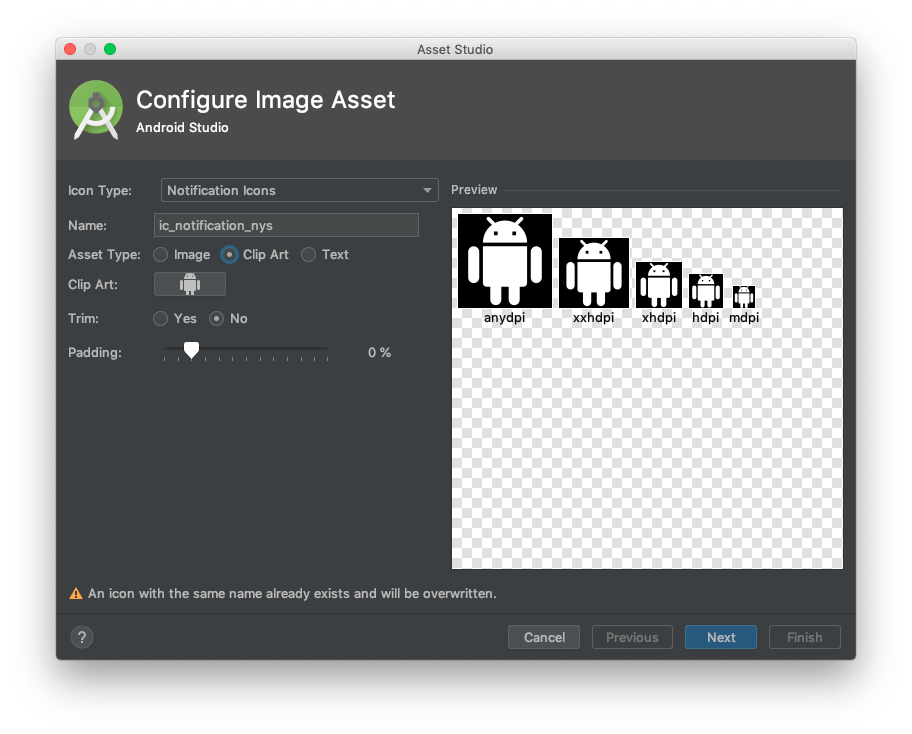 (AndroidStudio3.5)如果您使用的是最新版本的Android,您可以生成通知图像。右键单击res文件夹 > New >ImageAsset.然后,您将看到配置图像资产,如下图所示。将图标类型更改为通知图标。你的图像必须是白色和透明的。此配置图像资产将强制执行该规则。