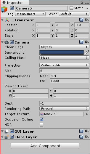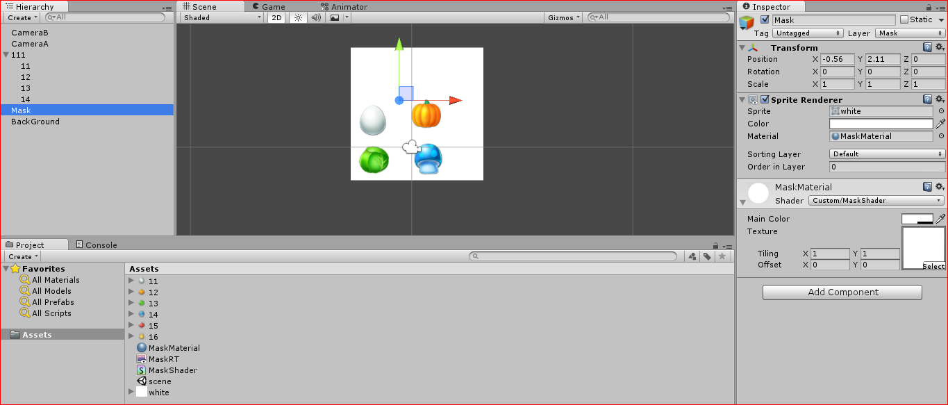 现在将这个新的材质和着色器分配到您的全屏精灵,并将您的MaskRT渲染纹理设置为蒙版着色器的输入纹理漫射。