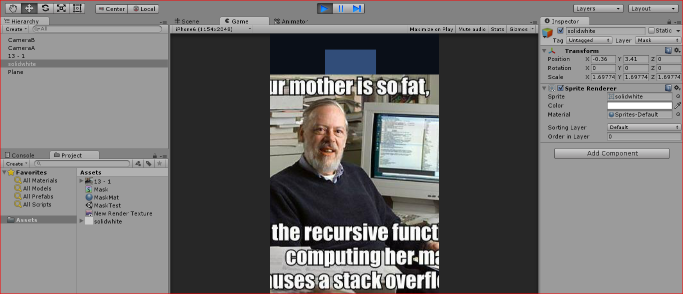 此时,您应该注意到,雪碧在“游戏”窗口或camA预览中不再可见。只有剩下的部分是可见的。当您选择camB时,只有平面会在预览中可见。来自camB的输出表示“漏洞”的位置。