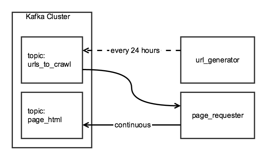 尽管爬行的两个组件是相关的,但我希望它们是独立的:url_generator将作为预定任务每天运行一次,page_requester将持续运行,在可用时处理URL。为了“礼貌”,我将调整DOWNLOAD_DELAY,使爬虫在24小时内很好地完成,但把最小的负荷在网站上。