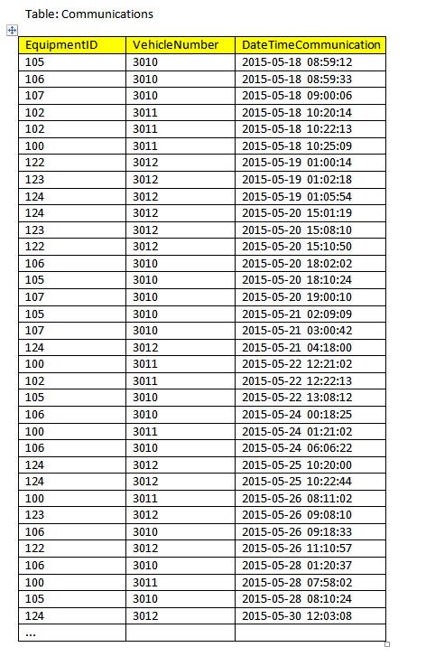我所拥有的是一个MS数据库,用于存储来自于安装在某些车辆中的设备的数据/信息(每辆车有1-3台设备)。