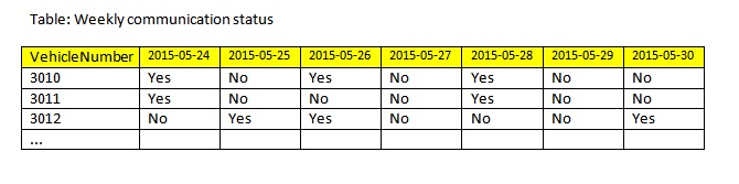 查询(命令/语句)来为所谓的“每周通信状态”创建一个表(视图),在这里我可以看到如果/车辆在过去7天中如何通信.如下表所示: