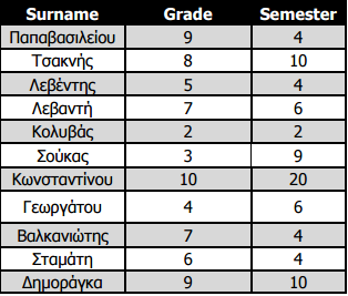 我想“打印”那些在同一学期的人的姓氏,但他们的分数最多比他们学期的最高分低2分。例如,在第四学期中,所需的姓氏是"Παπαβασιλείου“(最高年级= 9)和"Βαλκανιώτης”(年级=7Βαλκανιώτης(9-2))。