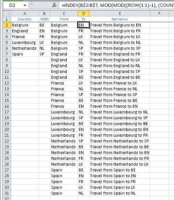 我试图生成一个矩阵,代表所有可能的旅行:从A到A,从A到B,从B到A,从B到B,唯一的限制是不从一个国家旅行到自己,。