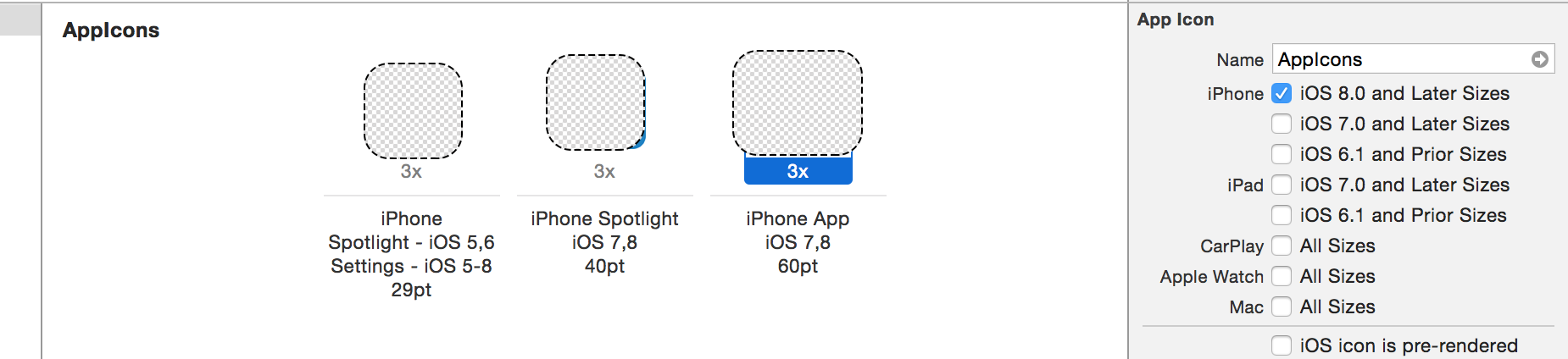 我在appIcons.asset for IOS8.0 >=中加载了所有正确的资产(它们被粘贴到照片中是为了保密)