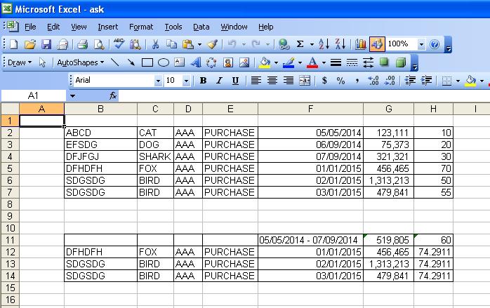 我想把前几个月的所有数据合并成一行,所以从下面的图片中,我想将05/05/2014-07/09/2014的数据合并起来,但保留最近一个月最的数据--的数据--而不是加在一起。因此,我需要将G列和H列中的数据进行汇总,对于第2-4行,其他列都不重要。