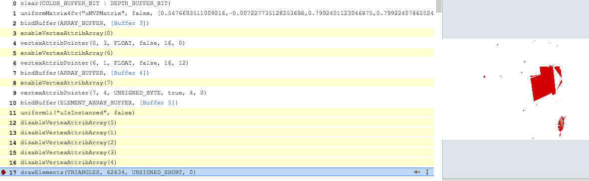 我在webgl中遇到了一个奇怪的渲染问题。每当我移动相机时,一些三角形似乎是随机丢失的。见下面的图片。我一直在找原因,但找不到原因。有什么原因吗?