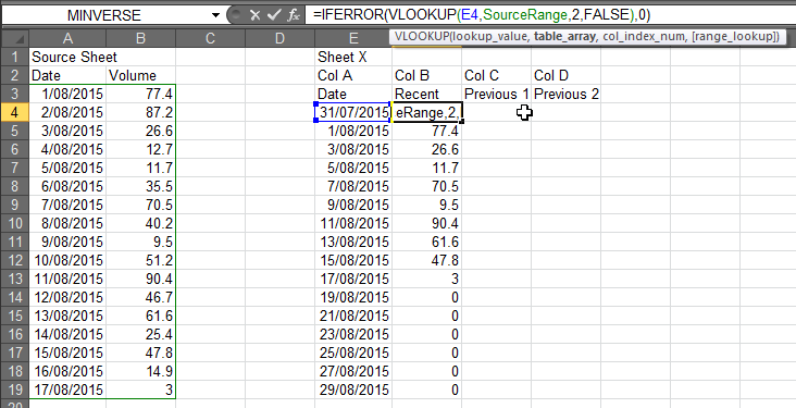 =IFERROR(VLOOKUP(<col A>,SourceRange,2,FALSE),0)为了举例说明,我把所有的内容都放在一张纸上: