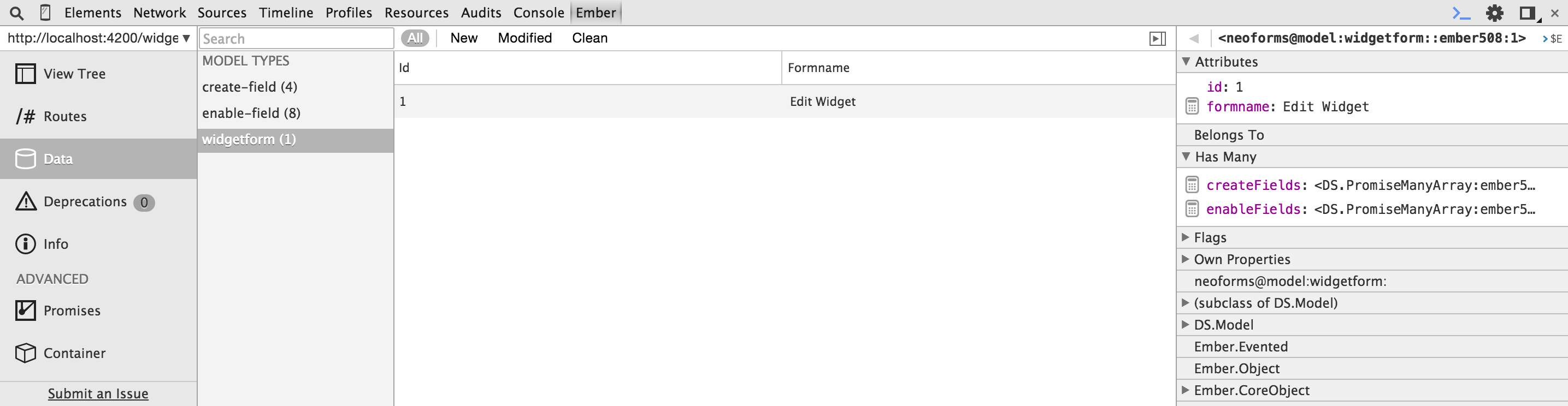 在create-field.js和enable-field.js中,您有widgetform: DS.belongsTo('widgetform'),但是没有在记录有效负载上指定widgetform_id: 1。您可能可以通过在inverse和hasMany定义中显式设置belongsTo选项来解决这个问题,但我建议只将关系ID添加到有效负载中。