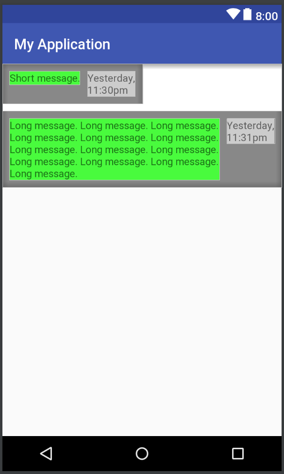 </RelativeLayout>我尝试在消息框右侧的空白视图上使用"minWidth“属性来提供间隔,但是它不会调整大小以变大(这会使消息框更小)。如果我没有空视图,只需将时间TextView放在消息框的右侧,那么当消息框展开时,TextView将不可见。