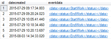 SELECT TOP 100 PERCENT id,datecreated,eventdata.value('(/data/status)[1]','varchar(max)') AS EventStatus FROM @tbl