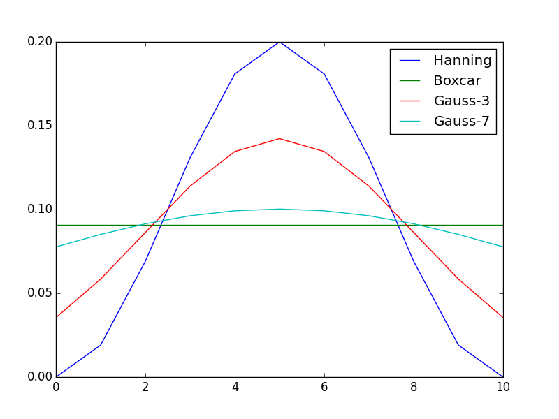 上面我使用了“boxcar”内核(常量值),很多人认为这个内核有点粗糙。人们通常更喜欢使用更锐利或更平滑的过滤器(例如,“汉宁”或“高斯”,如食谱中的那样)。