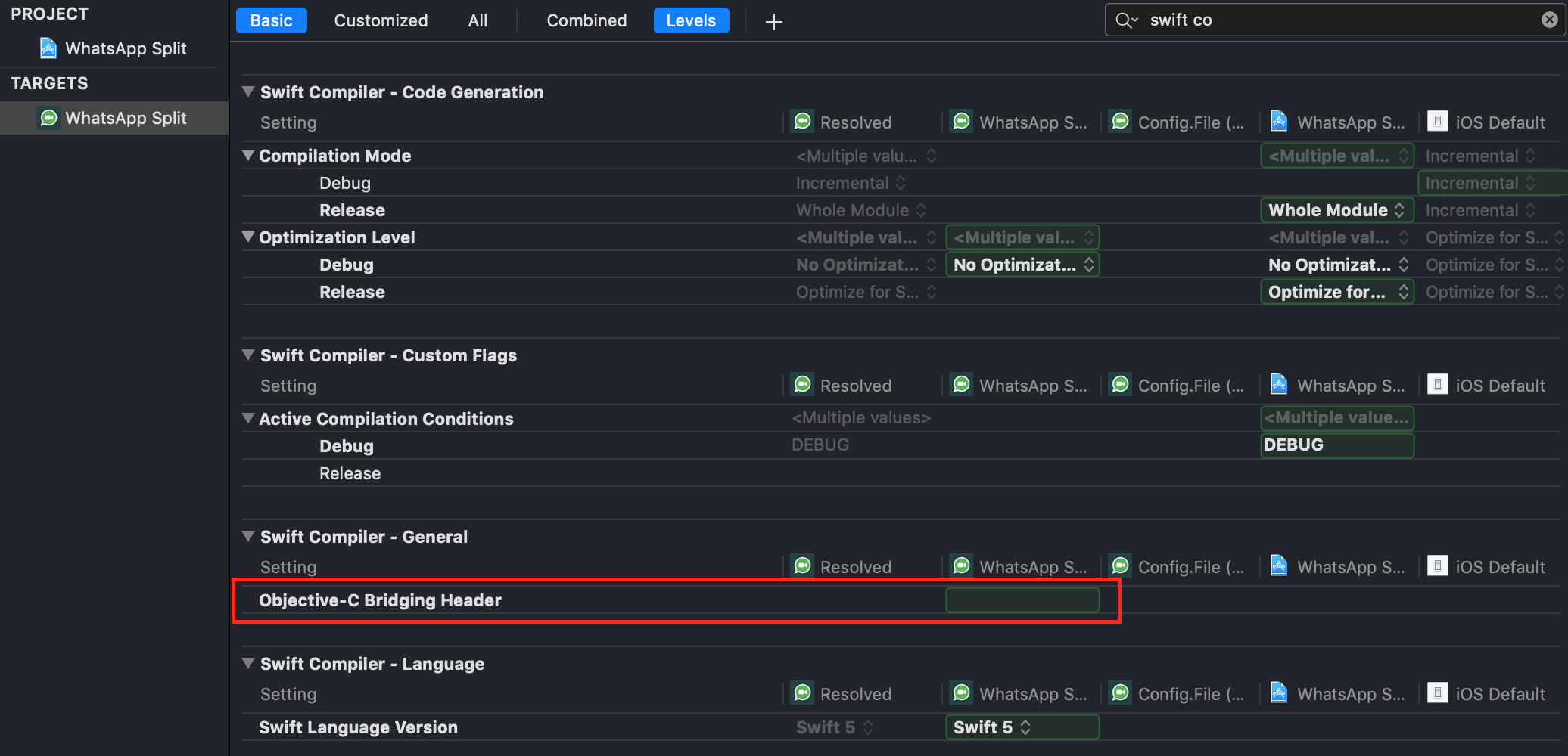 转到目标文件-> Bridging >Swift Compiler,删除与Objective桥接标头相同行中的内容