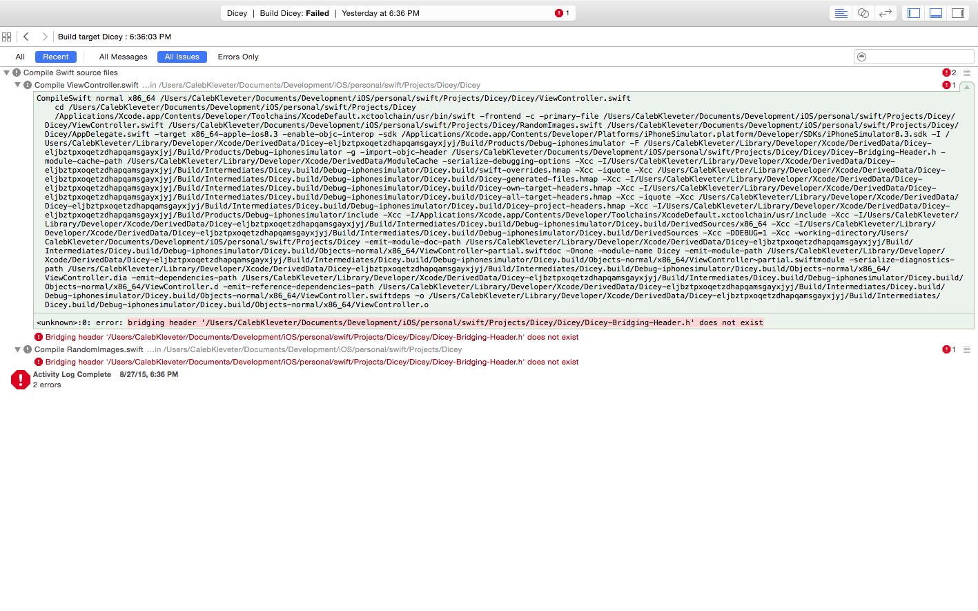 <unknown>:0: error: bridging header '/Users/CalebKleveter/Documents/Development/iOS/personal/swift/Projects/Dicey/Dicey/Dicey-Bridging-Header.h' does not exist