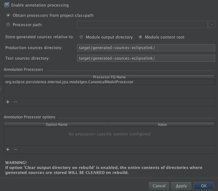 1) org.hibernate.jpamodelgen.JPAMetaModelEntityProcessor和IntelliJ IDEA和这个类已经生成到:target/generated-sources