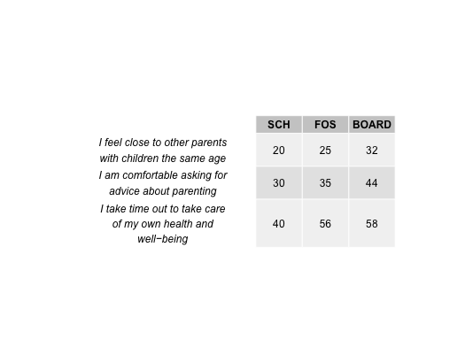 key <- c("I feel close to other parents with children the same age", "I am comfortable asking for advice about parenting", "I take time out to take care of my own health and well−being")