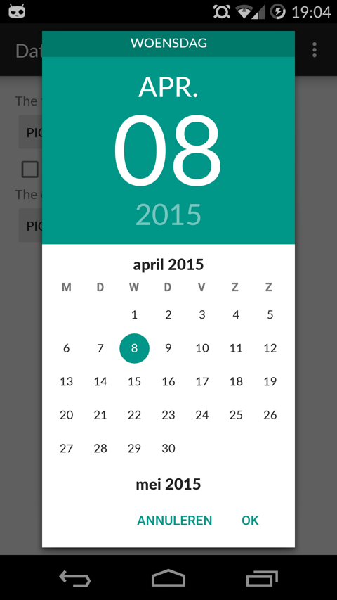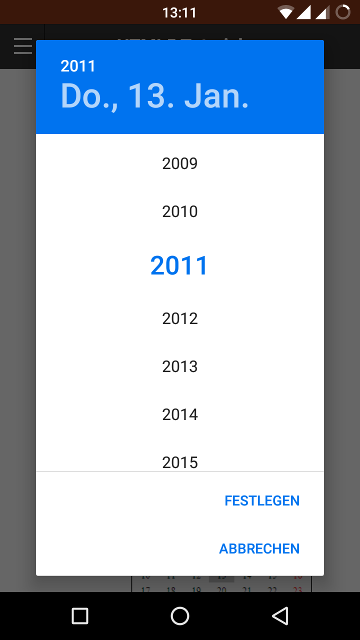 我使用的片段,创建材料设计DatePickerDialog点击EditText。麻烦的是它被设定为当前日期(由我设定)。但是,如果用户必须选择过去的日期.比如说,10年前,用户每个月都要滚动,这是痛苦的。例如如下所示: