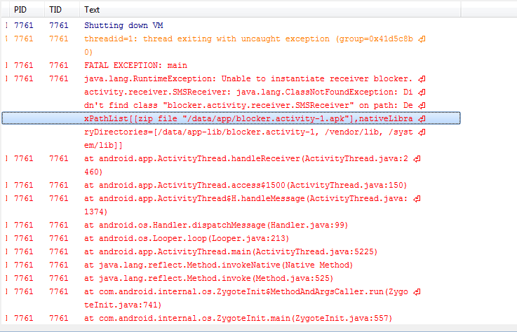 我在这段代码中使用了一个接收器,在运行和接收sms之后,会显示这个错误。我试着做点什么。我创建新项目并再次添加文件。删除bin文件。清理并重新启动项目。但它不能解决错误。有什么东西能解决这个错误吗。我真的解决不了这个问题。