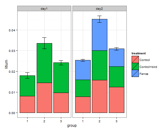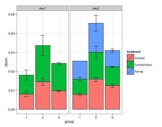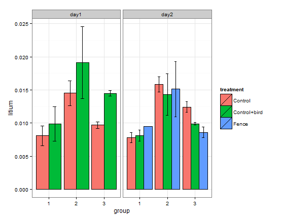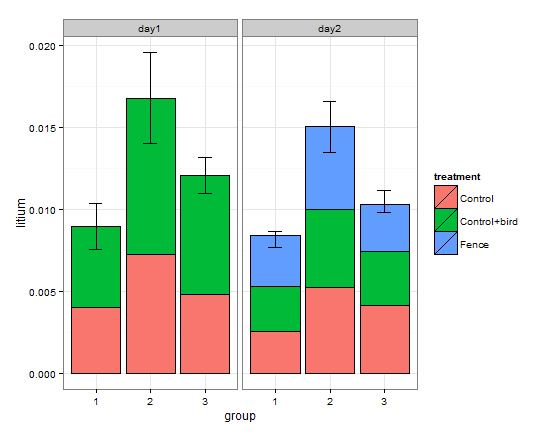 geom_bar(data=mus3, aes(x=group, y=litium, fill=treatment),
