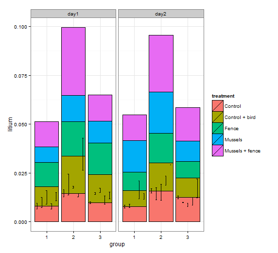 如果你只想要这个组的错误条,那么你必须在治疗中得到整个组的错误,而不是这个组的错误,但是你不能把它直接加到基于整个组的平均值中,因为这些是均值,堆叠的条形图有平均值的总和,所以你必须从mus3