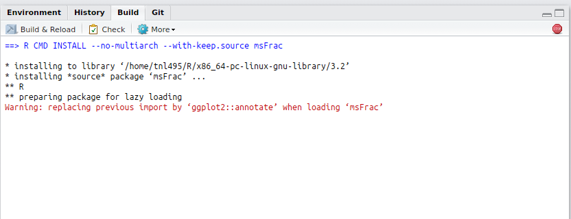我曾经为R开发一些包,因此,这是一个迭代过程,在这个过程中,我需要通过rstudio安装包,然后再添加一些必要的功能来检查包之间的工作情况。因此,我使用了以下过程: