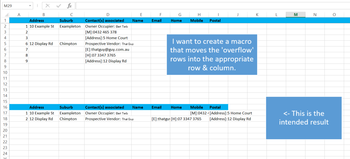 一旦数据在正确的列中,我需要将移动自动化到正确的行中。我可以很容易地让他们向上移动,但如果一个联系人没有电子邮件地址(例如),那么当他们移动时,电子邮件将出现在错误的行中。