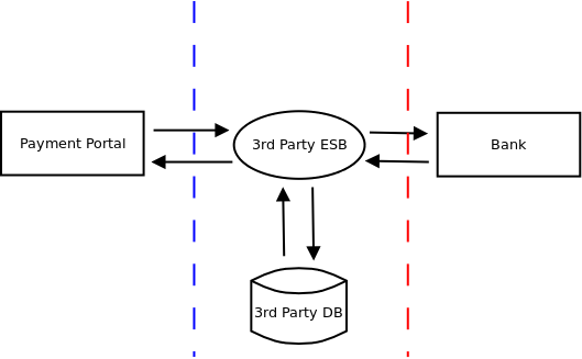 我已经用垂直线(红色,蓝色)清楚地标记了边界。涉及到三个方面。支付门户,银行和第三方。
