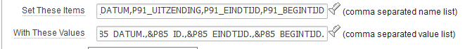 通常发送到下一页的唯一变量是P91_UITZENDING (Uitzending的PK )。幸运的是,我需要的其他变量( eindtijd、eindtijd和datum)是Uitzending的属性,因此我能够在相应页面项的源代码中使用如下语句派生它们: