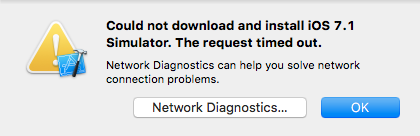 无法下载和安装iOS 7.1模拟器。请求超时。网络诊断可以帮助您解决网络连接问题。
