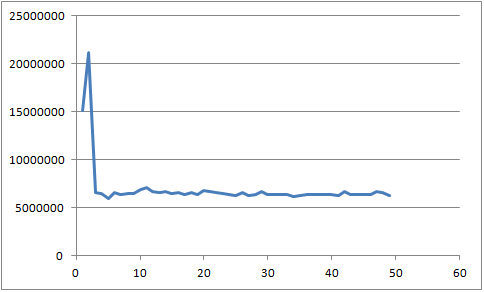 请注意,即使在这里,最快的解决方案是使用一个线程,但您可以清楚地看到,偶数线程的执行速度更快,因为我使用的是一个i5,它有两个核心,但通过超线程作为4工作。