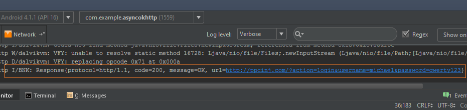String urlToDownloadToken = baseUrl + "?action=login&username=michael&password=qwerty123";