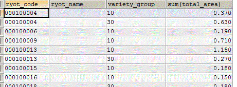 SELECT ryot_code, ryot_name, variety_group, SUM(total_area) AS theSum