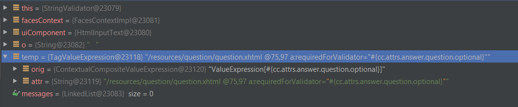 </h:inputText>如您所见,我尝试将此信息作为传递参数传递。它在网页上呈现为真/假,但当我试图在验证器类中获得它时,它是某种类型的对象,没有在网页源代码中显示值,而是使用来自.xhtml文件的代码。