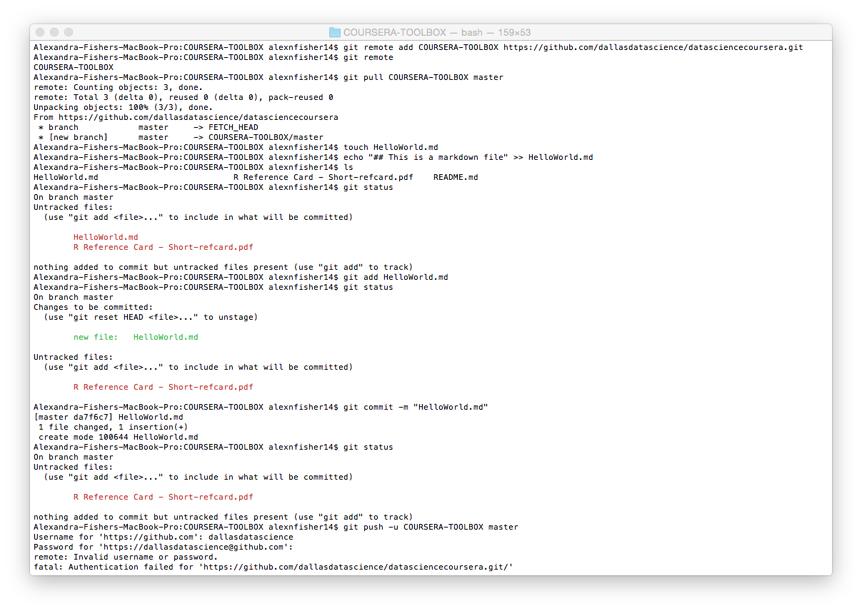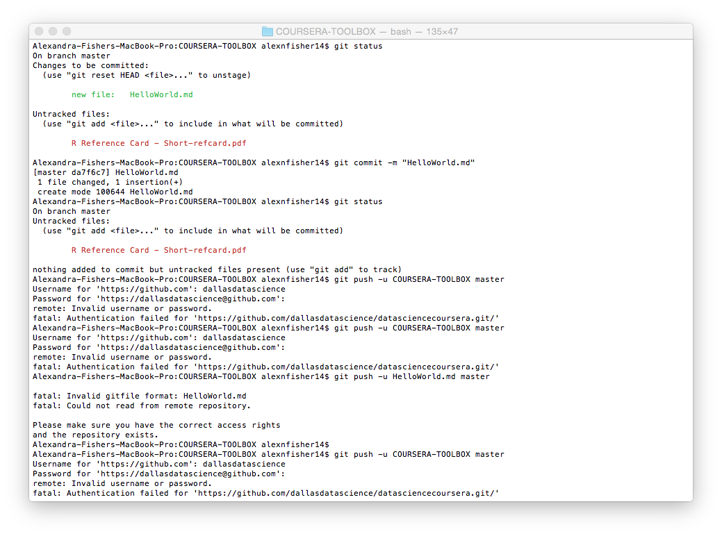 GitHub身份验证问题在创建HelloWorld.md标记文件和使用Git将文件推送到GitHub上的存储库(用于数据科学家的Coursera工具箱项目)时