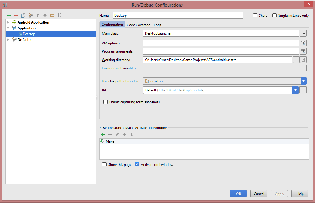 问题是,正如您所知,libgdx为您的项目创建了一个特定的模块,以便在不同的环境(ios、android、桌面)上运行。我在尝试运行桌面模块时遇到了一个问题。它会给出以下错误。我把它贴在这里: