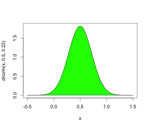 my_curve(dnorm(x, 0.5, 0.22), xlim=c(-0.5, 1.5), fill="green")