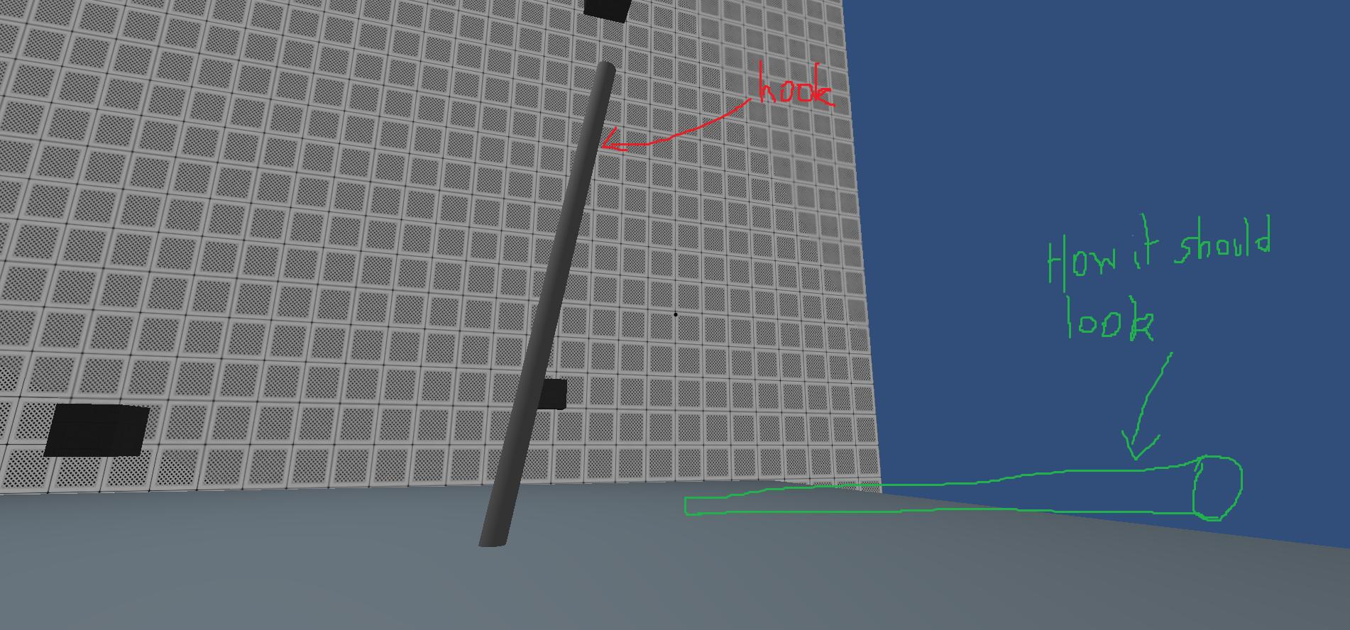 hook.transform.rotation = Quaternion.Euler(hookDestination - rightHandPosition);你可以猜到这两点是rightHandPosition和hookDestination。目前,圆柱体在“随机”位置产卵,具有“随机”旋转和巨大的尺度。