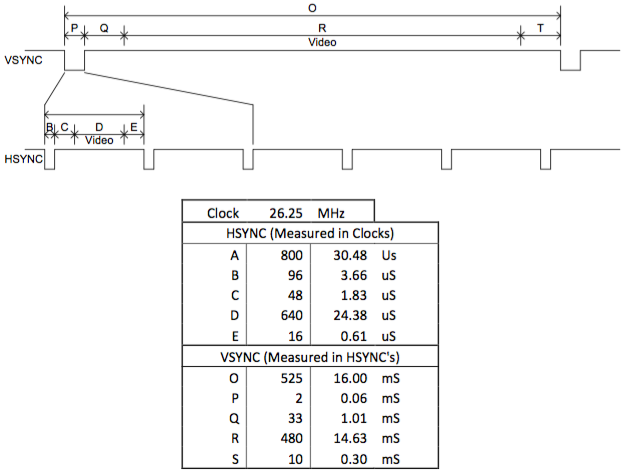 我正在实现一个模拟时钟,它将显示一个小时和分钟的手在vga屏幕640x480与时钟中心在480 x480。钟每分钟更新一次。下面的时序图显示了HSYNC和VSYNC的时序以及它们相对于26.25MHz时钟的位置。
