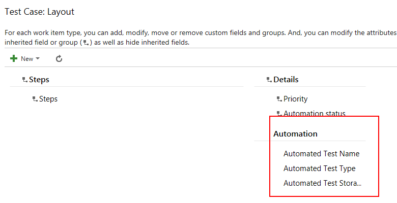 显示与测试自动化相关的字段的唯一方法是现在使用VSO: