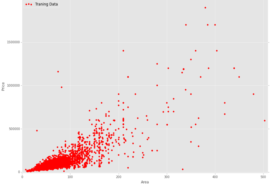 我要用多个变量进行回归分析。在我的数据中,我有n =23个特性和m = 13000训练示例。以下是我的培训数据(房屋面积与价格对比):