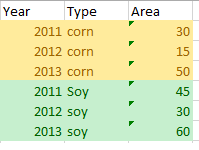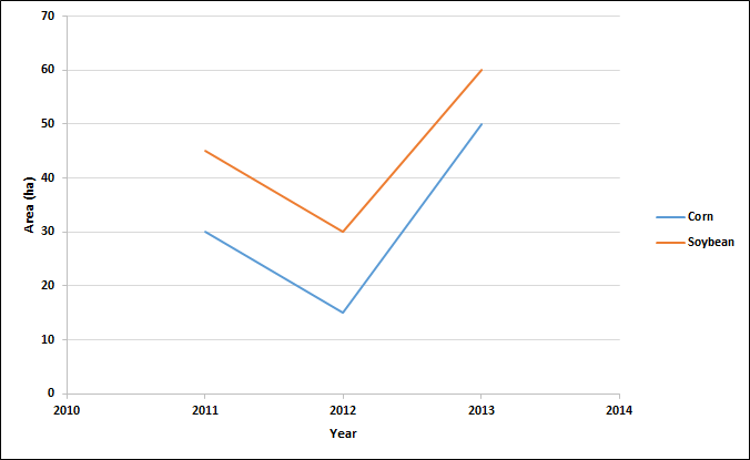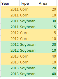 我希望将数据按年划分为玉米和大豆的总面积,并将其放入一个新的表格(图2),其中包含年份、类型和总面积,然后按年绘制每个区域的总面积(图3中的小区示例)。