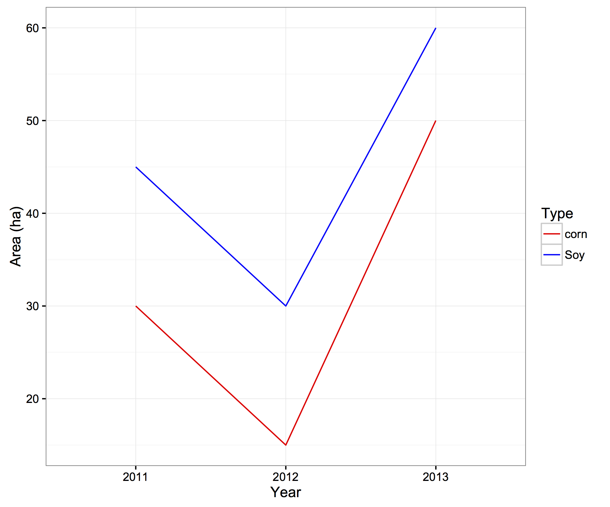 ggplot(data=data.df, aes(x=as.factor(Year), y=Area, group=Type, color=Type)) + geom_line() + xlab("Year") + ylab("Area (ha)") + theme_bw() + scale_color_manual(values=c("red", "blue"))